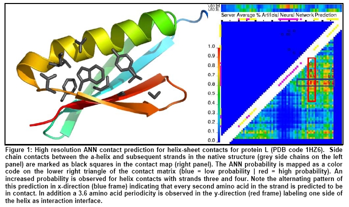 The ANN requires an input of two sequence windows spanning the potentially interacting SSEs, having the two directly contacting amino acids in the center. In a preliminary experiment, the length of these sequence windows was chosen to be 9 residues for α-helices and 5 residues for β-strands. In result both SSEs have about the same length of 12Å for the interaction interface. For each amino acid in these windows predicted secondary structure, position specific scoring matrices from PSI-BLAST, and a property profile are used as input. Five separate ANNs were trained for helix-helix, helix-sheet, sheet-helix, sheet-sheet, and strand-strand interactions. In result these networks can specialize on the high resolution characteristics of these interactions. A non-redundant fold database (less than 25% sequence identity) is used for training, consisting of ~1800 proteins. All amino acid pairs within one fold that are in contact are used for training. The dataset is balanced with an equal number of non-contacts. An example prediction from a preliminary test network is shown in Figure 1.