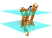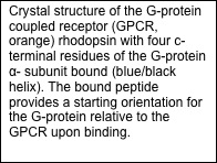 Rhodopsin is a G-protein-coupled receptor (GPCR), which are integral membrane proteins with seven transmembrane helices. When activated by an extracellular affecter, GPCRs bind to G-proteins, catalyzing the release of GDP from the G-protein. The alpha subunit of the heterotrimeric G-protein (Galpha) can then interact with intracellular partners and propagate the signal into the cell. The protein arrestin binds to GPCRs in order to regulate their activity.
