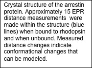 Crystal structures exist for the G-protein, as well as activated rhodopsin bound to the C-terminal tail of Galpha, but not for the rhodopsin/G-protein complex. In addition, crystal structures exist for arrestin proteins, but not in complex with a GPCR. Currently, we use Rosetta in conjunction with EPR distance and mobility measurements in order to model the rhodopsin/G-protein complex and conformational changes occurring as the G-protein binds to rhodopsin. EPR distance measurements are also used to model the conformational changes of arrestin as it binds to rhodopsin.