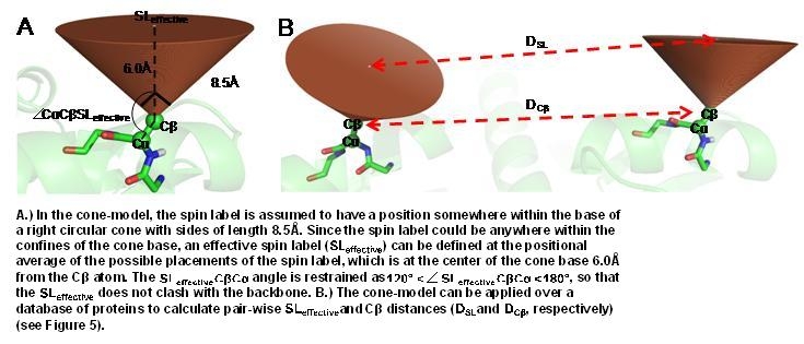 In order to overcome these limitations, we couple EPR data with the BCL protein structure prediction algorithm. The de novo folding aspects of the BCL provide biological information which is not encompassed by the EPR data, while the EPR data improves the efficiency and accuracy of the search for a protein’s structure. A low-resolution cone-model approximates the conformational space available to a spin label and provides the foundation for the BCL to treat the spin label implicitly during protein structure prediction. Having an implicit representation allows the BCL to remain fast and efficient even while leveraging the information content available in EPR data.